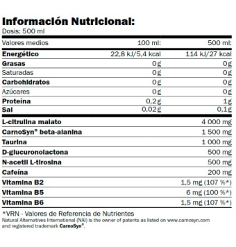 Ingredientes: agua purificada, L-citrulina malato, dióxido de carbono, CarnoSyn® beta-alanina, acidulante:ácido cítrico; taurina, acidulante: citrato de sodio; D-glucuronolactona, N-acetil L-tirosina, conservantes: sorbato de potasio y benzoato de sodio; cafeína,aroma, edulcorante: sucralosa; antioxidante: ácido ascórbico, edulcorante: acesulfame-K; ácido pantoténico (vit. B5), riboflavina (vit. B2), hidrocloruro de piridoxina (vit. B6).