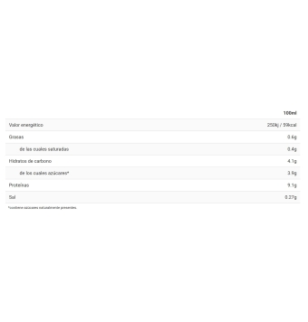 Ingredientes: Proteínas de la LECHE (54%), LECHE desnatada, LECHE desnatada en polvo, cacao desgrasado (1.5%), estabilizantes (E-339, E-452i, E-460, E-466), emulgente (E-471), lactasa, edulcorantes (glucósidos de esteviol procedentes de estevia (0.007%), acesulfamo k, sucralosa) y aromas.