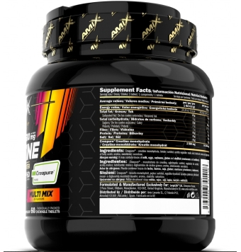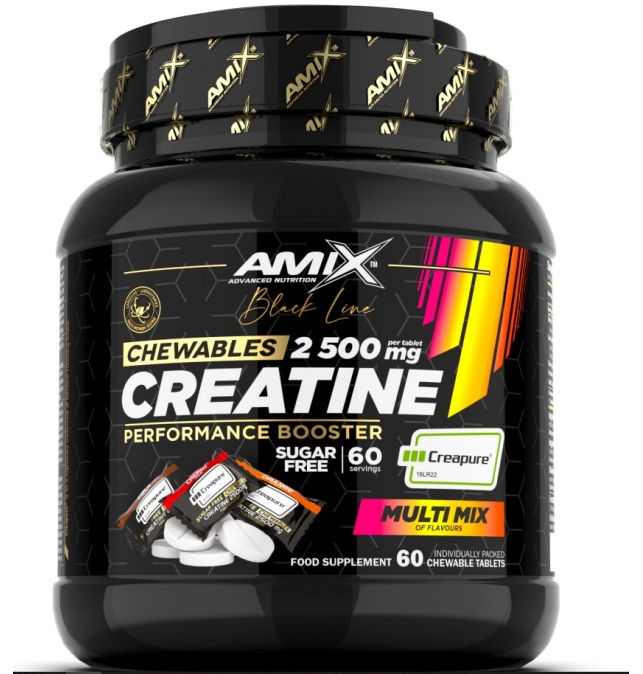 Creatina Amix 2500 mg Masticables: contiene monohidrato de creatina Creapure® , diseñado para una suplementación eficaz de creatina en la dieta de atletas y personas activas. Su práctico formato masticable permite un uso fácil en cualquier momento del día. La creatina aumenta el rendimiento físico en ráfagas sucesivas de ejercicio corto de alta intensidad. El efecto beneficioso se obtiene con una ingesta diaria de 3 g de creatina.