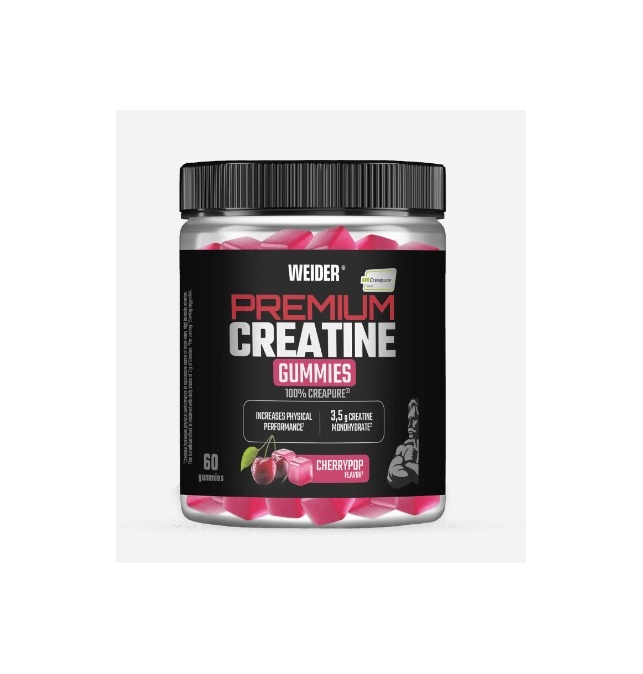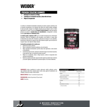 Premium Creatine Gummies de Weider son una forma innovadora y deliciosa de complementar tu entrenamiento con creatina monohidrato de alta calidad. Formuladas con Creapure, una de las creatinas más puras y eficaces del mercado, estas gomitas ofrecen una alternativa práctica y sabrosa a los formatos tradicionales en polvo o cápsulas.