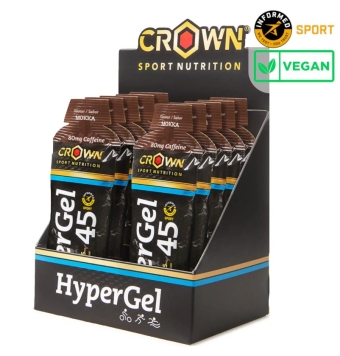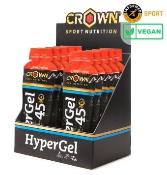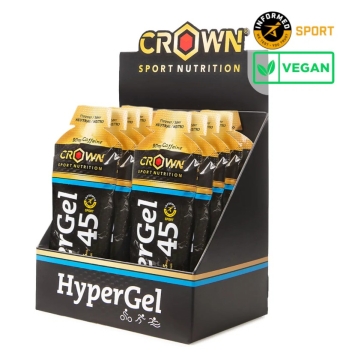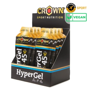 En Crown Sport Nutrition han pensado en todos aquellos atletas que necesitan un aporte mayor de carbohidratos durante la práctica deportiva, por eso hemos desarrollado la línea de productos de gel, barritas y bebida Hyper(1:0,8). Con estos se pueden alcanzar fácilmente consumos superiores a los 60 g/hora de carbohidratos. HyperGel 45 es un Gel Energético Alto en Carbohidratos: